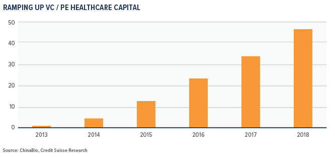 Frost & Sullivan estimates that China will have the world’s fastest-growing biotech industry by 2021, with an annual expansion rate of 16.4% over the next five years. In 2017, the total value of domestic and international Chinese biotech initial public offerings reached a record of USD2.8 billion. Venture capital and private equity investment in Healthcare had also been ramping up quickly. Healthcare capital investment grew at a CAGR of 132% between 2013 and 2017, while domestic venture capital investment reached a record of USD17.4 billion in the biotech sector in 2018.