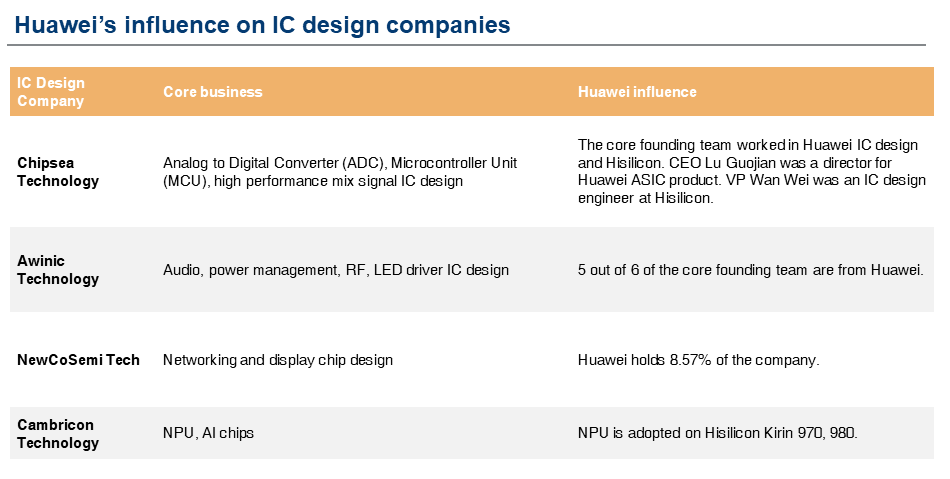 We see two key positive impacts Huawei has on China’s semiconductor industry. First, the quick growth of Hisilicon creates jobs for chip design as the company hires and trains many IC design engineers which enlarge the talent pool in China. Hisilicon hires around 7,000 staff globally, the majority of whom are located in China and headquartered in Shenzhen1. Huawei also has a large research institution called the 2012 lab (more details below). Second, Huawei has strong bargaining power in the semiconductor supply chain, which puts it in a position to support domestic companies. There are two layers of this dominant position. Huawei is a top tier terminal maker in smartphone and telecom equipment, so this allows the company to use domestic IC solution when it is available. In addition, Hisilicon has the industry’s leading design which generates large orders. It had around 13% market share in smartphone SoC in FY192. Huawei can allocate orders to support the domestic semiconductor supply chain. Semiconductor Manufacturing International Corporation (SMIC), for example, had around 17% of sales from Huawei in FY193, producing various Hisilicon–designed chips.