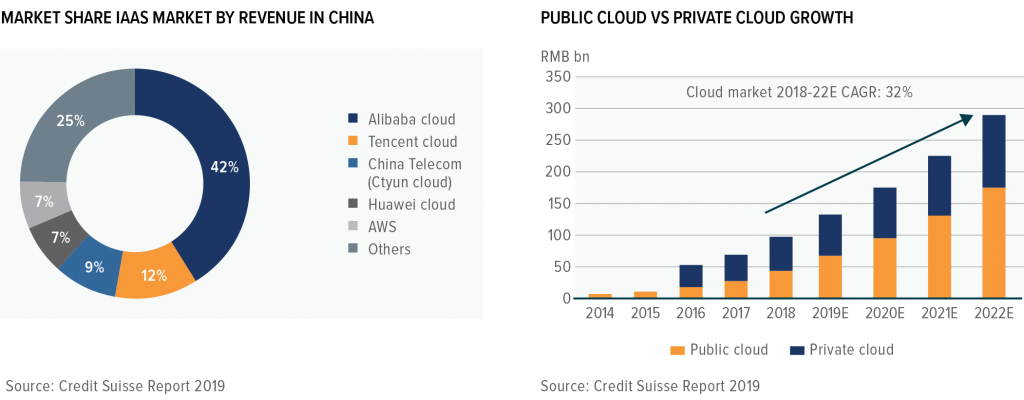 According to the Ministry of Industrial and Information Technology (MIIT), the cloud market in China is expected to grow at a Compound Annual Growth Rate (CAGR) of +32% for 2018-2022E, reaching RMB 290bn (US$41bn) in 2022. The public cloud is estimated to reach a 60% share of the total cloud market by 2022 from 40% in 2018.